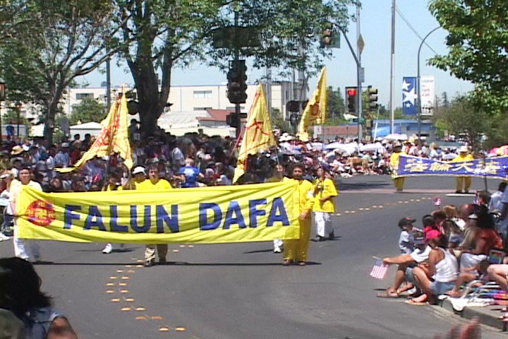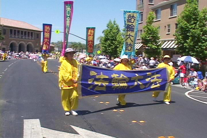 部份湾区法轮功学员参加了加州湾区阿拉米达(Alameda)市举行了传统的每年一次的独立日游行。7月4日上午9点钟,在游行开始前两小时,学员们就已在游行的出发点列队排练了。游行于十一点开始,一百五十个不同团体身着各式服装的队伍走在一起,附近的居民很多都全家一起在路边观看游行队伍。