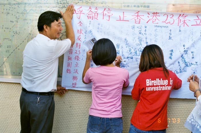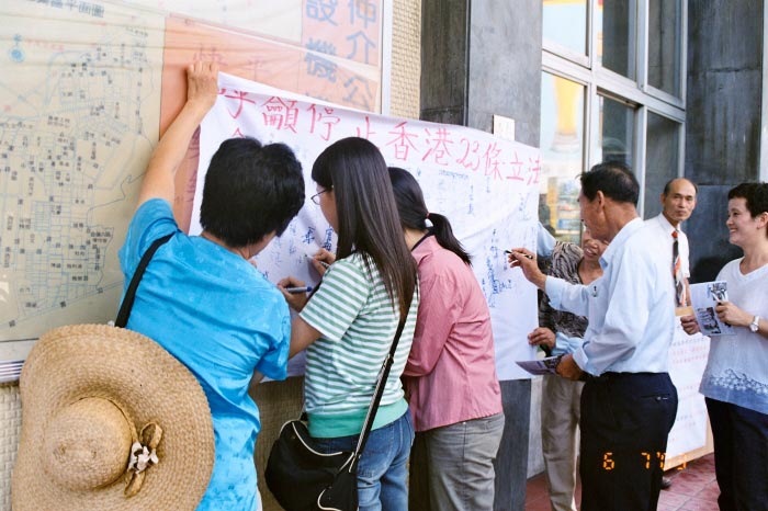 香港拟立法的基本法23条,以所谓防止分裂国家等七种叛乱颠覆罪为名,不但将威胁港人的人权与言论等自由,甚至还包括境外人士。7月5日、6日,反对23条立法的台湾民众自发地利用周末假日,到中部各人潮聚集的地点──台中市火车站、丰乐公园、大里国光花市等处募集签名,台湾中部民众纷纷响应,两天下来,征签人员征集了满满数条布条的名字。