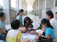 7月5日明慧学校举行校外洪法讲真相,参观台南市「福尔摩沙」照片展,参展时大法小弟子的良好表现,让导览人员深深感受到大法小弟子的不同。参展结束时正好巧遇吕副总统莅临,人潮众多,小弟子并在现场展示功法传达大法之美好。(见图五、六)