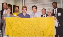 参议员一走进办公室,她首先见到的就是几位法轮功学员。她认真听取了关于法轮功在中国受迫害的情况,特别是美国公民李祥春被非法关押迫害的近况。学员们展示了几天前在安娜堡市艺术节为营救李祥春征集签名的黄布横幅。斯泰比诺参议员非常感动,并表示要与在场的六位法轮功学员一起手持横幅合影。