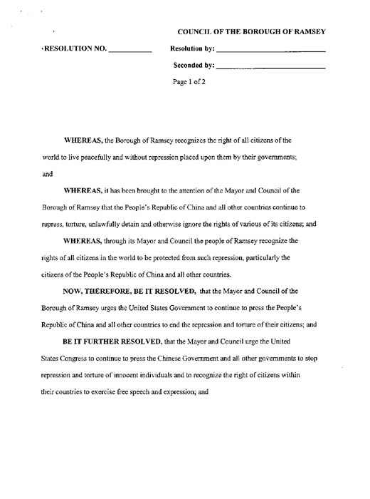 鉴于,市长与市议会代表其人民认同全世界人民,尤其是中国人民和其它国家的人民应受到保护免遭这样的压制的权利。