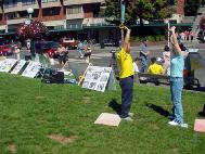 户外炼功点洪法效果好。最近我们在多伦多两条大街的街边绿地上建了一个炼功点。周一至周四早6时至8时,晚7时半至8时半,周六、日早8时半至10时半。洪法效果非常好,过往行人很多,经常会有人向我们询问,拿资料,现在陆续有新学员进来学功。而且还不断有路人在看到我们祥和的功法时,非常渴望地询问是否也有类似的炼功点在他们的居家附近,并索要有炼功点和联系人的传单。建议有条件的学员都能出来炼功,一个点不一定很多人,两三个人,拉个小横幅在自己家附近的绿地、公园就行。就象7.20之前的中国大陆,到处都能看见炼功点,人们很方便地就能找到我们的炼功点。
