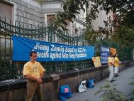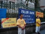 8月2日,匈牙利和奥地利的大法弟子来到布达佩斯的中国驻匈牙利大使馆前举行和平抗议,我们发正念并给行人分发关于中国政府对法轮功学员迫害的真相资料。我们轮流发正念、炼功,由此形成了一个非常祥和的场面。当时有许多行人,因此有许多交谈的机会,我们详细地给人们讲述了在中国发生的这场迫害情况。