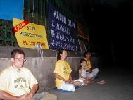 一位过路的女士向我们表示她的祝愿,她非常敬佩我们的勇气。有一名5岁的小弟子非常热心的散发传单。只要有人路过拐角,她就立刻跑过去,有礼貌地向行人打招呼,从那里经过的行人都拿了她给的资料,并报以善意的微笑。整个晚上都很祥和安静。很长时间以来,匈牙利的学员每周都在那里举行一次烛光守夜。