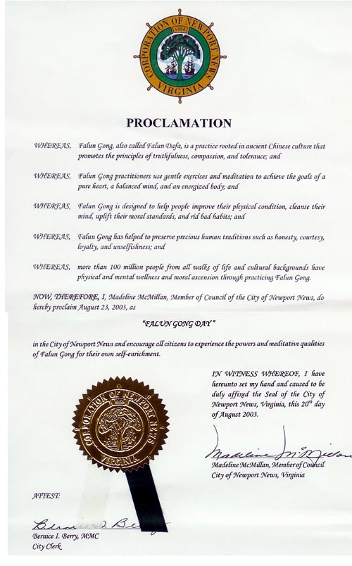 并鼓励纽波特纽斯市全体居民来感受法轮功的威力和静修特性以充实自身。