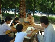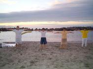 孩子在海滨浴场集体炼功也起到了很好的洪法作用。孩子炼功我们在旁边纠正他们的动作,觉得孩子的炼功动作不那么好看。可是,当有事离开时,在远处回头一看,在沙滩的炼功场面是那样的祥和美丽引人注目。在那里开店的一个老爷爷,看到孩子们的炼功后,给孩子们送来两个西瓜并借给我们开西瓜的刀子。我们谢谢他,并送给他大法报纸,开始他好像不太感兴趣,当我们说:这是刚才孩子们炼的法轮功的报纸,对身心都有好处。他接过报纸而且表示回去认真阅读。