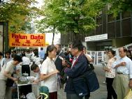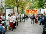 下午,戴女士去了巴黎中国城,在那里,她讲述了她丈夫所遭受的迫害、她起诉江泽民的理由、以及法轮大法的真相。过路的中国人们都很注意,一些人还专心地听了中文,然后又听了法文;许多人还拿了真相材料在他们周围发。