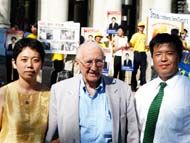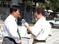 | 市长Shay(中)与当地法轮功学员合影 | 曾因报导法轮功而获奖的自由撰搞人麦特-海参采访陈刚 |