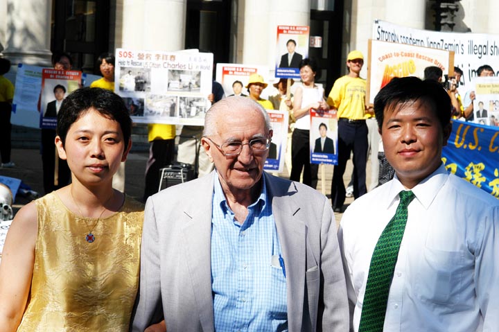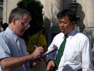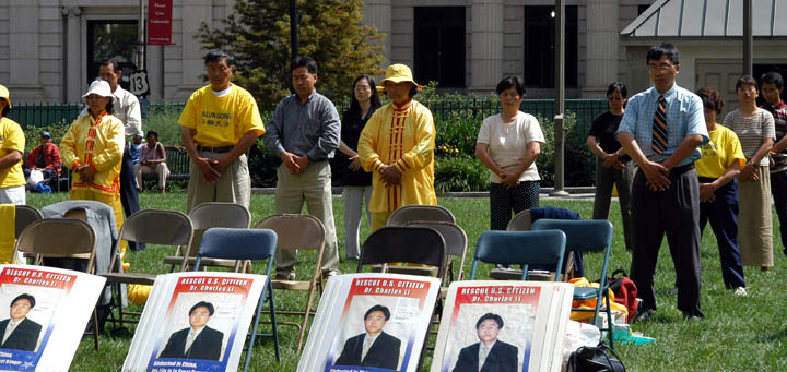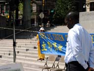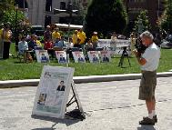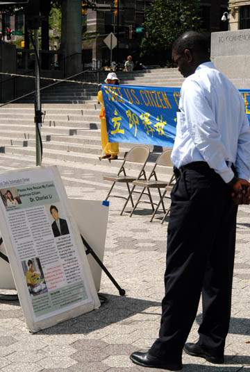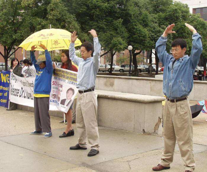 法轮功学员冒着雨在新闻发布会前后演示了功法。当天有许多路人惊闻美籍法轮功学员李祥春被非法关押在中国。许多路人都纷纷签名支持请愿。他们也踊跃地接受我们发的真象传单。