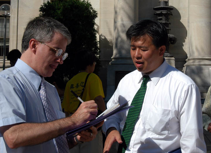 麦特对法轮功学员说,“这会是一篇很有力的文章。上次报导法轮功时,我采访了陈刚在南泽西的家人,当时他们正为遭受折磨的陈刚担忧。现在我能拍到戴着领带的陈刚,站在营救李祥春的横幅前,这非常有感染力。”