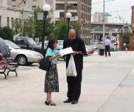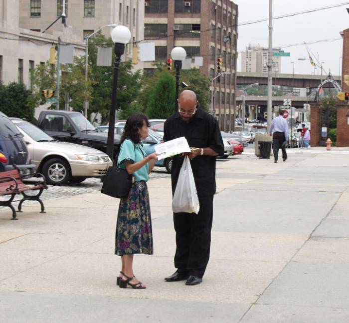 在报社前台,一位名叫Mattie的女士接待了我们。问清来意后,经查询,她答复说编辑们都忙,没有人能见我们。我们就请她将预先准备好的资料转交给有关编辑,同时将其中的资料一一介绍给她看。开始她是很客气地一边说着“OK”,一边接受着每一份资料,但慢慢地我们发现她神情变得越来越严肃,眉头也慢慢皱起来。当看到法轮功学员在中国监狱中遭受酷刑的图片时,她忍不住惊叹。随即转身向里边的编辑办公室走去。原来她又重新去为我们找编辑。当时我的心怦然一动,从她的神情和举动,我看到了从她心中唤起的同情、正义和良知。