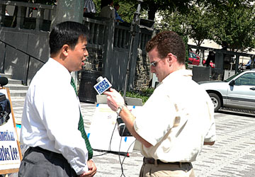 | 特拉华州威明顿市议员THEOPALIS GREGORY 主持新闻发布会 | 威明顿市电视台前来采访报导 | 法轮功学员炼功 |