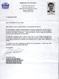 工党领袖、交通和重大项目发言人奎克(Graham Quirk)在贺信中说,“在你们为人权和法轮功的修炼准则而努力奋斗的时候,我相信在这样时刻相聚在一起将会很有收获。我希望你们会从中汲取更多并获得新的力量投入你们的努力。事实上,这次心得交流会无疑既包含着满足和幸福,也有着遗憾和关注,为着你们那些海外的同修们曾经经受过的苦难和许多正在承受痛苦的同修。让我问候每一个参会的朋友……祝交流会圆满成功。”
