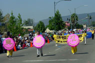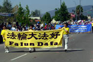 法轮功的游行队伍由三部分组成,第一部份是由身着唐装的女学员组成的舞蹈队。她们伴随着音乐翩翩起舞,向鲍威市的人民展示着中国的传统文化,令观众们耳目一新。第二部分为法轮功的游行花车。花车上“法轮大法”和“真善忍”的字样格外醒目。五位年龄不等的东西方法轮功学员坐在彩车上展示法轮功功法。他们宁静祥和的表情向人们展示着大法的美好。第三部分是由29名学员组成的刚刚成立不久的圣地亚哥腰鼓队。