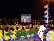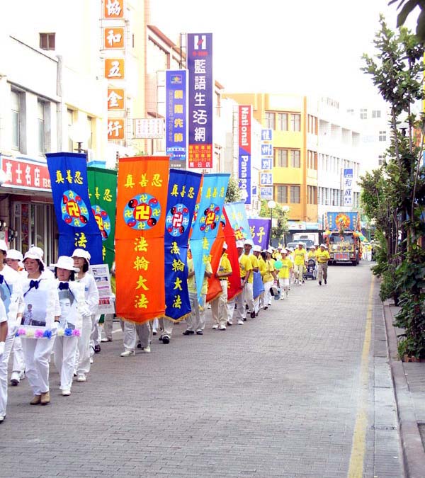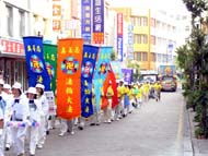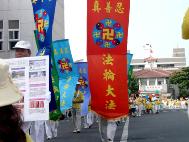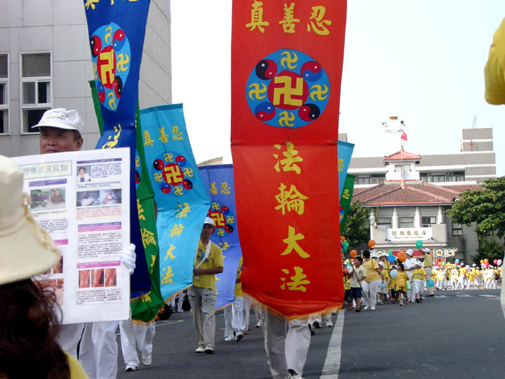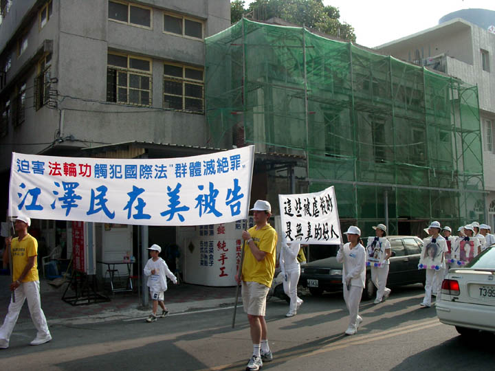 20日下午开始举行花车游行马公市区,揭开这次活动的高潮。由一位西人学员和台湾学员举着的「江泽民在美被告」的横幅为游行前头,将此次游行的目的清楚的表达出来。沿途当地居民感到相当好奇,纷纷从店(家)门口出来,站在路旁仔细瞧个究竟。
