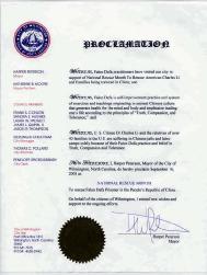 鉴于,法轮大法学员来到我市声援全美营救月活动,营救美国公民查尔斯-李及在中国遭受酷刑的家人;并且