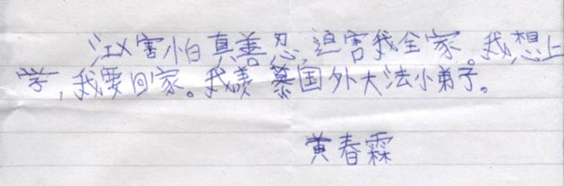 【明慧网2003年9月24日】黄春霖,今年10岁的小男孩,家在辽宁省铁岭市,现随其母亲被迫流离失所。他的母亲金红玉因修炼法轮功并多次进京上访讲真话,先后被北京市公安西城分局、铁岭市公安局银州分局非法关押四次,并被劳动教养一年(院外执行,即被勒索5000元人民币)。黄春霖自小跟随母亲生活。在99年,其母亲、姨和姥姥因修炼法轮大法,均被非法抓捕、关押期间,年仅六岁的黄春霖与重病在床的姥爷无人照顾,生活十分艰难。