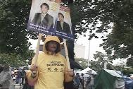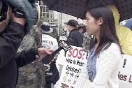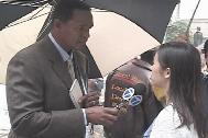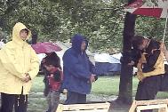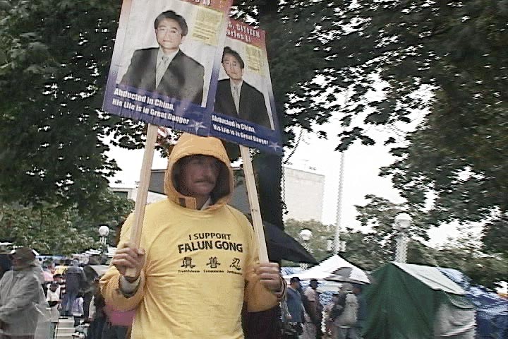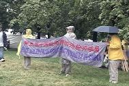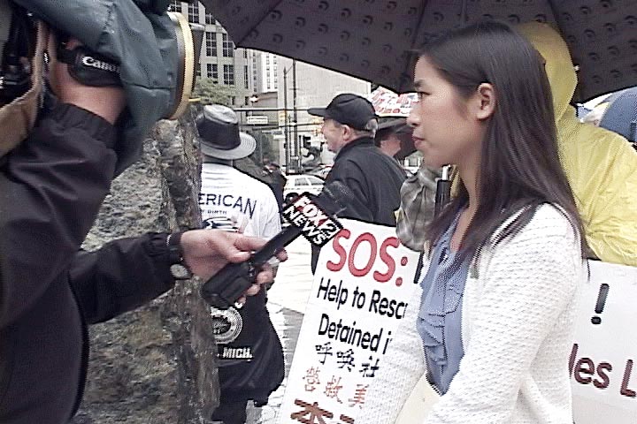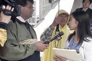 | 第二电视台记者访问符泳青 | 从加州一路参与的西人弟子 | 在雨中持横幅的弟子 |