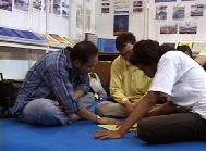 | 展出翻译成各国文字的法轮大法著作约三十多个版本 | 想知道法轮功多一些,干脆坐下来问。 | 小弟子在演示功法。 |