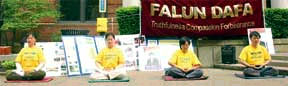 法轮功(也称法轮大法)的学员们于星期三在威廉匹特学生联合会前散发资料并展示他们的打坐功法。