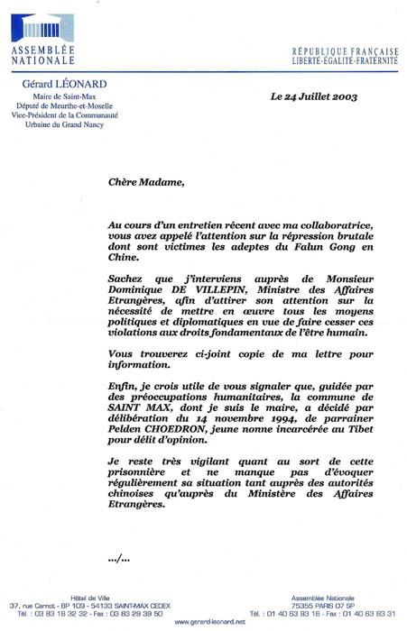 最后,我觉得有必要告知您,我担任市长的圣-马克斯市,出于对人道主义的关注,在1994年11月14日的决议后决定做培尔登-硕德龙,一位以观点罪被关押在西藏的年轻尼姑的保护人。