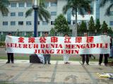 学员们在当场拉起了一条“全球公审江泽民”大横幅。活动的联系人法轮功学员法扎说:“我们同样要把江泽民告上法庭,因为在中国对法轮功的迫害江负有无法推卸的责任。”