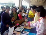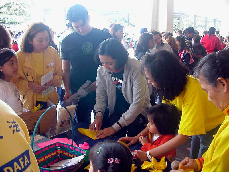 在活动中,学员们同时举行了“和平花瓣”的折花活动,别致的纸折荷花顿时吸引了人们,特别是家长和孩子们。每一朵花都代表着一份祝福送给那些在中国由于江氏集团迫害法轮功修炼者而失去父母,失去家庭温暖,失去学业的孩子们。一位中学老师要了多份“和平花瓣”的材料说要发给她的学生。