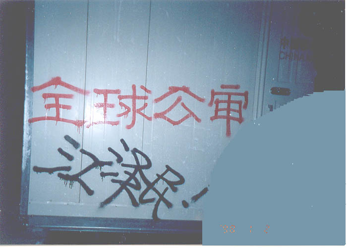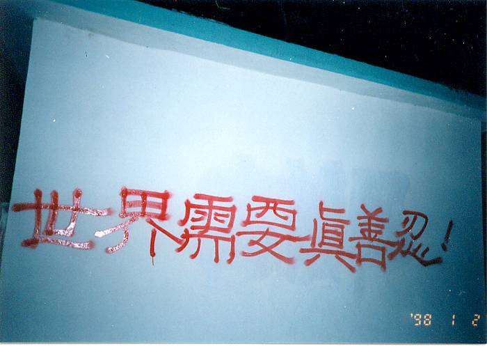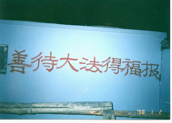【明慧网2004年1月29日】东北某市的大法弟子喷字时拍的照片,由于相机的日期没有调整为当前的日期,所以看到的是98年。