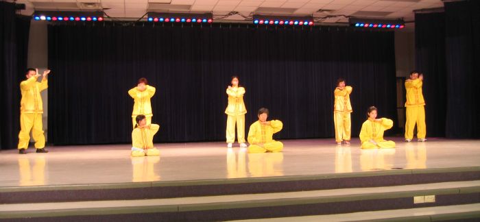学员们表演的第二个节目,是由9名学员组成,身着金黄色炼功服的法轮功功法表演队,8名学员为来宾们演示祥和、优美的五套功法,一名上高中的小弟子在舞台的讲台上为功法的动作做解释。功法表演队包括了所有年龄段的人,小学生,中学生、高中生、青年、中年至老年-- 一位七旬的老年弟子。观众们知道了每个人都可以炼法轮功,当学员们随着庄严、祥和的炼功音乐,展示着优美、舒缓的功法的时候。台下,有的学生、家长、老师也情不自禁地跟着学起来。