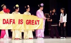 表演结束后,学校给学员们颁发了褒奖,感谢对他们活动的贡献及带来了这么好的中国的传统文化。在结束后,一个华裔中学生碰到身着炼功服的学员时用中文说:“法轮大法好”!