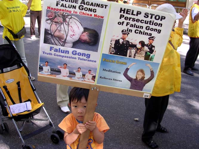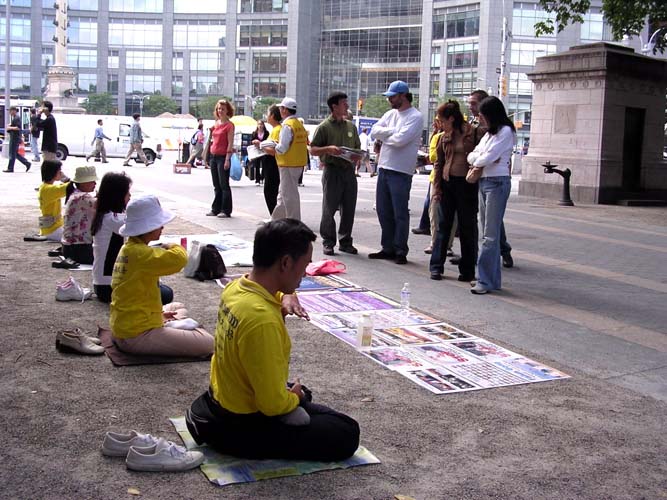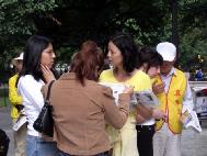 也有人问法轮功学员,为什么站在这里,告诉人们这些事情?学员告诉他们,因为中国大陆封锁所有法轮功真实的消息,并操控媒体散布对法轮功污蔑的消息,使世界上的人不了解法轮功在中国大陆被江氏集团打压迫害的真实情况。所以,法轮功学员才会用自己的时间与金钱,自发的到这里来向人们讲清真象。