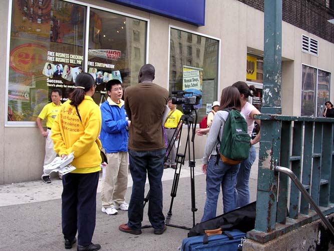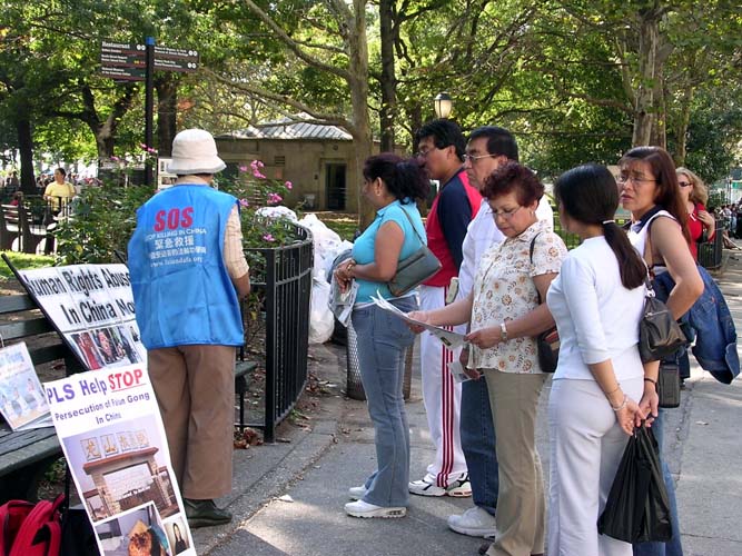 【明慧网2004年10月1日】(明慧记者综合报导)近日来,在纽约曼哈顿各个街角、旅游景点、公园及人潮聚集处,穿着黄色衣服,炼功或举着展板向路人说明法轮功真象的法轮功学员,俨然成了纽约的另一个特色,同时也成了人们关注的焦点。