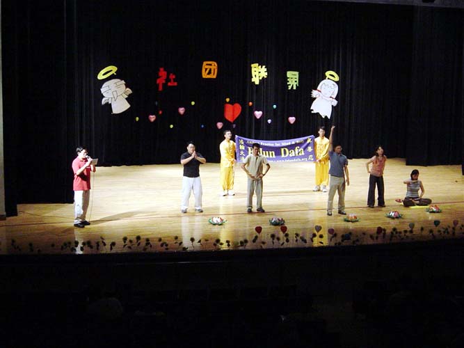 中山大学有不少的国际交换学生,因此在开学前,同修就制作了有英文“Falun Dafa”、“Ancient Practice for Mind & Body”及网站的横幅,在中山大学的炼功点都会挂上,而在这次的晚会上,为了让所有不同国家的学生都能了解法轮大法,因此在表演中,我们也用上了英文的横幅。