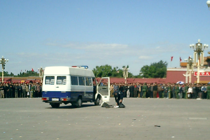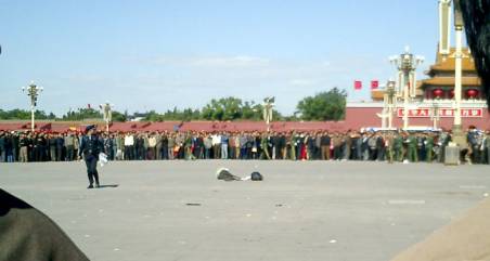 到达了我们以往的洪法地点,觉得如果能到瞻仰大道旁,让更多的人看到,一定会起到更大的效用。所以,当下决定去跟警察讲真象说明原由。原以为会有些难度,没想到警察笑眯眯的说,这边空间这么大,只要不影响到别人,到哪儿都行啊!