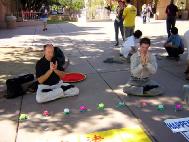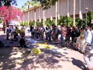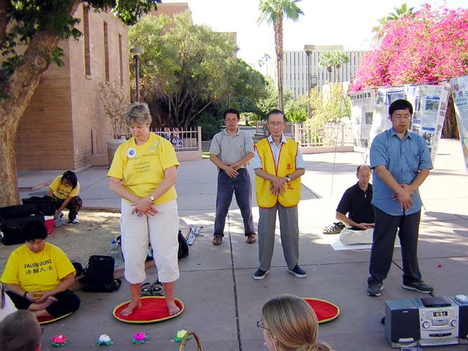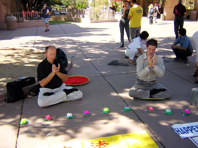 2004年10月13日,我们凤凰城的大法弟子与开车赶来的拉斯维加斯大法弟子,瑞典大法弟子,及图桑大法弟子一行15人来到亚利桑那州立大学的校园开始我们洪法讲真象的活动。我们在校园的中心地带摆设大法洪法图片,及揭露江氏流氓集团残酷迫害的酷刑展图片,一部分弟子随着优雅的炼功音乐炼起五套功法,一部分弟子向来往的人们散发真象资料。很多过往的学生及来访人员纷纷被我们的展位所吸引而驻足观看,我们在炼功的弟子面前摆上一些美丽的纸制莲花,不少人主动拿我们放在图片角上的真象传单并仔细观看,有疑问的主动向我们询问,也有不少人向我们索要莲花。很多看过酷刑展图片的人都被江氏集团的残暴所震惊,不少人不由自主地说“我的天,他们(江氏流氓集团)怎么可以这样灭绝人性?”“我的天,(江氏流氓集团)太残忍了。”有的人特地带朋友来看酷刑展图片,并把大法弟子告诉她的真象转述给她的朋友。