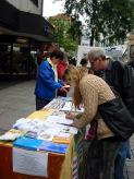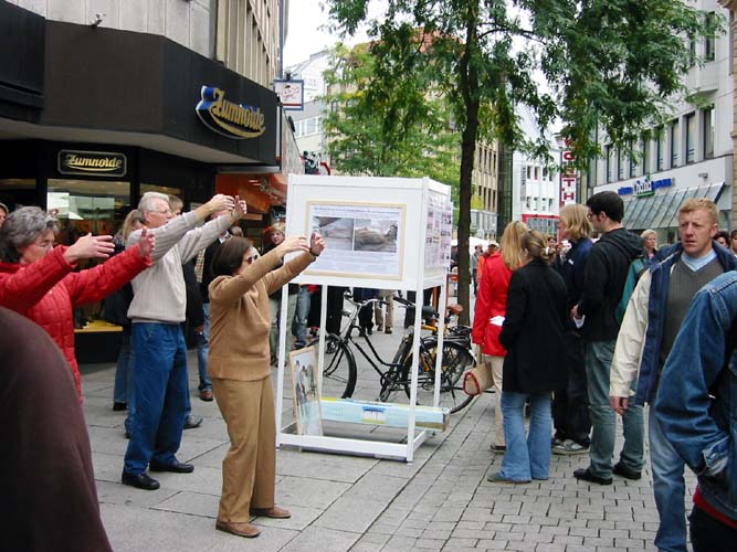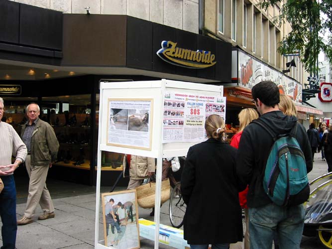 在欧斯纳布鲁克,街道上挤满了人,他们主要是来购物的,大批的人潮经过法轮功的信息展位,由于太多人潮汇集,人们都被后面的人推進经过展位,所以几乎不可能与任何人交谈或散发传单,但是仍有大批感兴趣的人群设法围绕在展板旁观看,许多人也过来在请愿书上签名,支持将迫害法轮功的前中国国家领导人江××送交法庭,审判其所犯群体灭绝、酷刑和反人类罪行;在欧斯德侯兹-斯洽姆贝克,也有许多人知道了有关法轮功和正发生在中国这场迫害的真象。