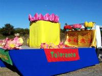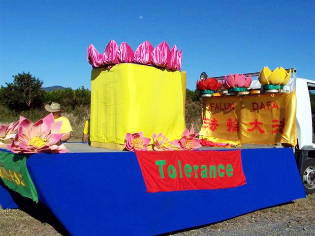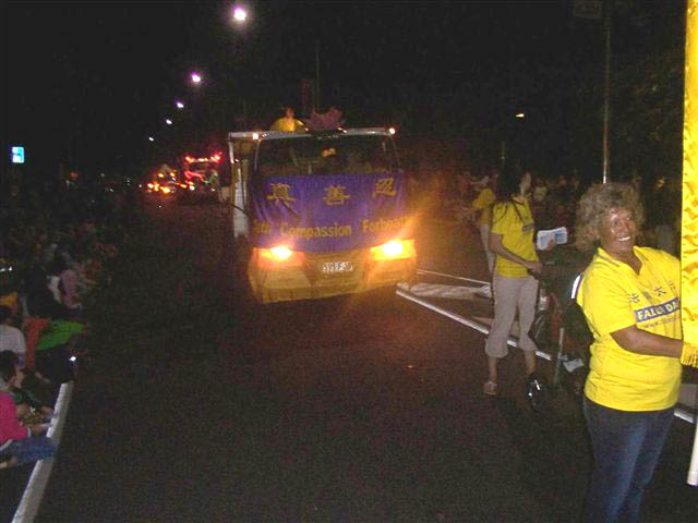 游行快要开始时,我们点灯照亮法轮图,可保险丝马上就烧掉了。换了保险丝后,灯不久又灭了。司机和学员们一起开始发正念,不久灯就恢复了照明。我们的游行队伍很长,领头是两面横幅,然后依次是法轮图、腰鼓队,三面法轮横幅和花车。沿途还有学员散发介绍功法和讲述迫害的传单。