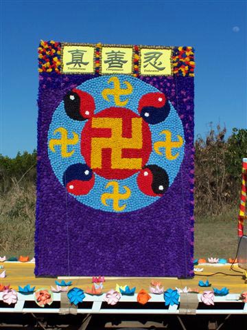 因昆省北部学员较少,该省其它地区的学员长途跋涉前往支援。当地学员花了一星期时间制作了一面大型双面法轮图,用各色绉纸卷成小球,一个一个的粘在一大型夹板的两面。 效果非常壮观。游行周六晚六时开始。学员们在白天准备了一辆小型卡车运载法轮图和花车。花车上装饰着很大的莲花和横幅,上有学员做功法演示。因叫灯光节,所有的运输设备都需灯饰。