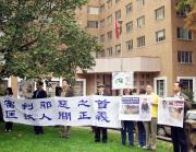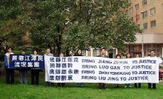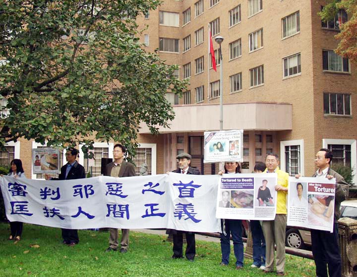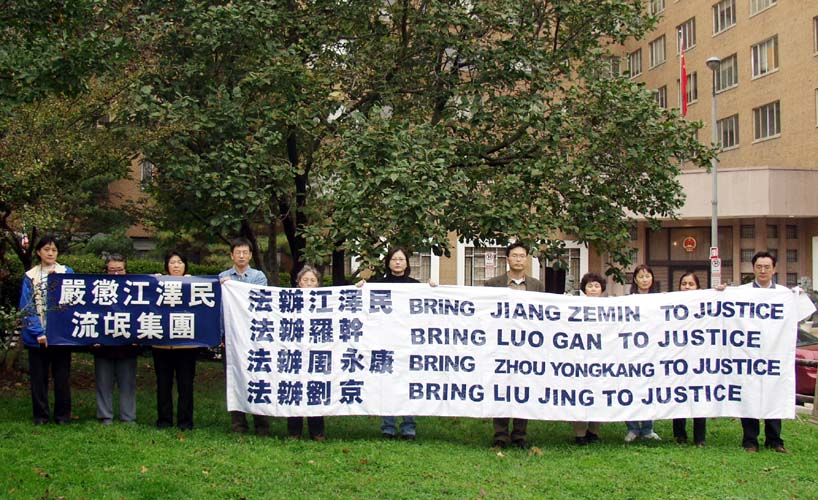秋日的华府空气中透着凉意,雨后的“天安门花园”仍很潮湿。在过去5年多的时间里,法轮功学员在中国大使馆前这一与北京的天安门遥相对映的街心花园已经举办过很多次活动。今天与以往不同的是,几十名华府法轮功学员除了一如既往的打着“审判邪恶之首,匡扶人间正义”、“反人类群体灭绝、江泽民罪责难逃”等要求严惩恶首江泽民的横幅外,还展开了一个带有更多明确诉求的,巨大的中英文横幅,“法办江泽民、法办罗干、法办刘京、法办周永康”。