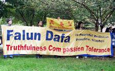 集会主持人黄博士介绍了这次集会的主要目地:“法轮功没有任何对政治制度、党派争夺的政治诉求。但我们将追究每一个在这场迫害中行恶的人的责任并将他们的恶行曝光,特别是罪大恶极的,更是要在各种场合给予揭露。江泽民、罗干、刘京、周永康就是这样的邪恶之徒。 ”