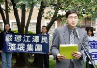 ![]() 新闻发布会主持人黄祖威博士 | ![]() 法轮功学员呼吁“审判邪恶之首,匡扶人间正义” |