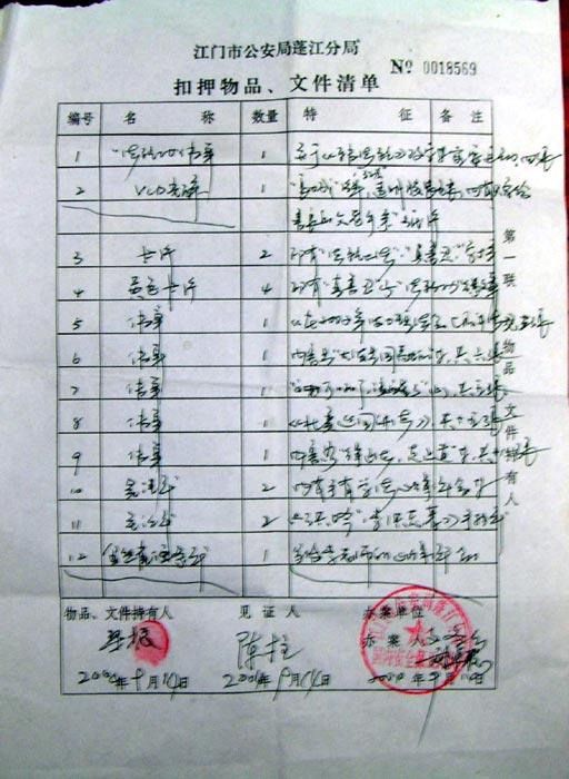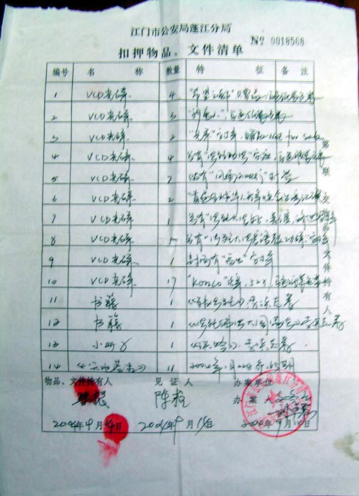 14日下午5点钟,三个蓬江区公安分局恶警到梁秋长家,非法抄家,当时家里只有她婆婆一人,被吓得手忙脚乱的哭了。随后,公公也回来了,见此情景也被吓呆了。恶警没有搜查令,走进房间乱抄东西,抄得房间里乱七八糟的,抄走了《转法轮》《洪吟》、真象资料、教功碟和其他的真象光碟等。恶警并骗取她公公的签名,在抄走物品的清单上按上手印。