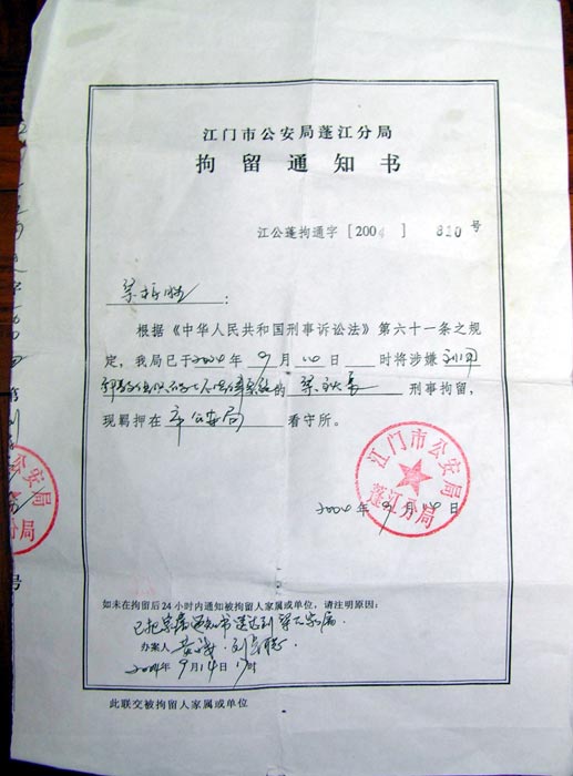 梁秋长被绑架到江门看守所非法关押,她丈夫多次要求见面,守门的说不能见。但被要求交了300元的伙食费。在不准家人见面20多天后,梁秋长被非法强制判一年劳教。