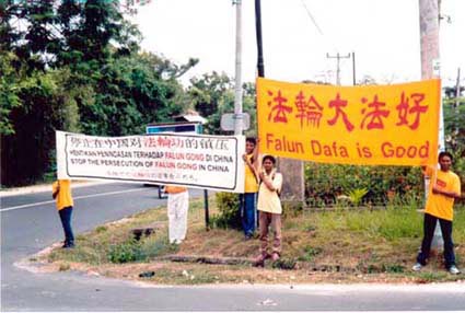 这个抗议活动,目地是让世人知道,全世界都知道在大陆的镇压法轮功是恶首江泽民和他的同伙所干,希望来访的中方代表团把学员们的呼声带回去,让更多的人知道真象,唤醒内心的良知。法轮大法已经成为全世界人民的,全世界人民都可以自由炼功和传功。