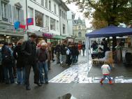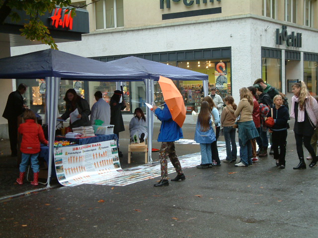 【明慧网2004年10月27日】瑞士法轮功学员继在苏黎世(Zurich)、巴塞尔(Basel)、卢塞恩(Luzern)、伯尔尼(Bern)、索洛通(Solothurn)等城市举行了揭露江氏集团罪恶的酷刑展之后,2004年10月20日又在巴登市(Baden)冒雨举行了酷刑展,部分德国法轮功学员也过境来参加了此次活动。