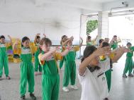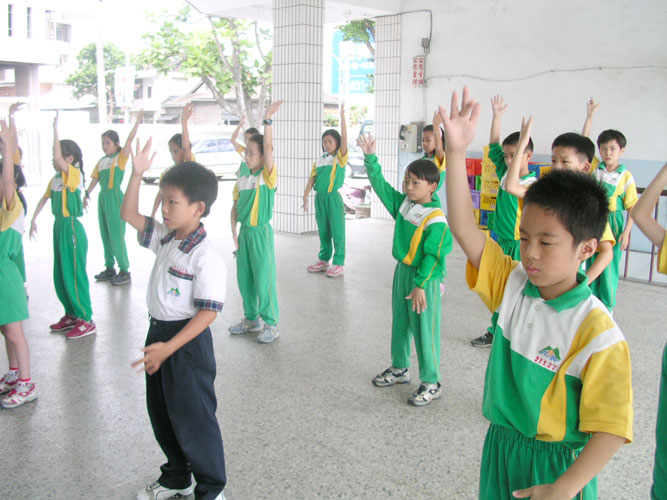 第三周:有感于偶尔听见他们挂在嘴上的轻蔑字眼不雅,于是讲述了一则“佛印与苏东坡”的趣事,要他们知道,讲了不好听的话,就是代表整个人都充满了粗鄙的心思,在此过后不久,只要有人说溜了嘴,其他人便一同善意指正。而在炼功中,女生表现极佳,男生中总有两、三位无法静下心来,大体上,第一套功法学得快又准确,第一次学功的表现,令人讶异。