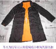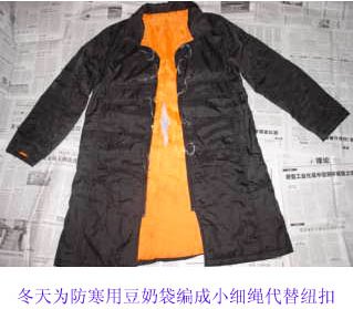此棉衣是一位女大法弟子在北京朝阳看守所被非法关押时所穿,衣服中间被撕坏的地方,是恶警为了检查棉衣中间是否夹带违纪品。衣服上的拉锁已被管教指使牢头拆掉,冬天为防寒,只能把豆奶袋撕成长条编成小细绳当纽扣。
