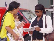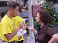 ![]() 来自芝加哥的Susan 在著名的水街55号和“越战退伍军人广场”前分发传单 | ![]() 宾州的Lynn在向一名过路者介绍法轮功 | ![]() 一名西方法轮功学员在水街55号前分发法轮功真象报纸 |
