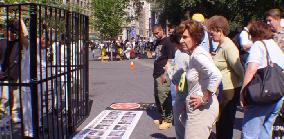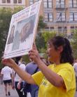 ![]() 露西亚教授在分发法轮功真象报纸。 | ![]() 人们参观在联合广场公园举办的酷刑展。 |
