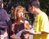 与其他团体的鼓噪形成鲜明对比的是法轮功学员的平和和理性,他们平静的向路人散发着介绍法轮功在中国被迫害故事的传单和报纸,并耐心的向每一位好奇或疑惑的询问者讲述中国法轮功学员被迫害的真象。而每一次的交谈都可以引出一个有趣而又动人的故事。